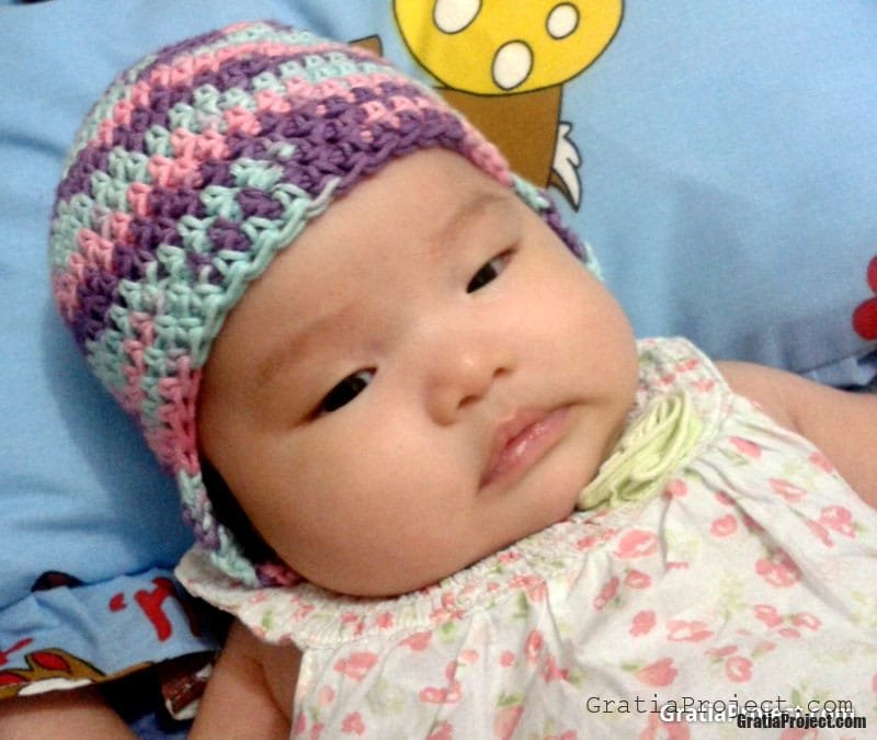 This is an easy crochet project for beginner. I use versatile earflap hat pattern, and make small adjustment to fit the hat to my baby. I use light worsted weight yarn and crochet hook size 8 (4mm).