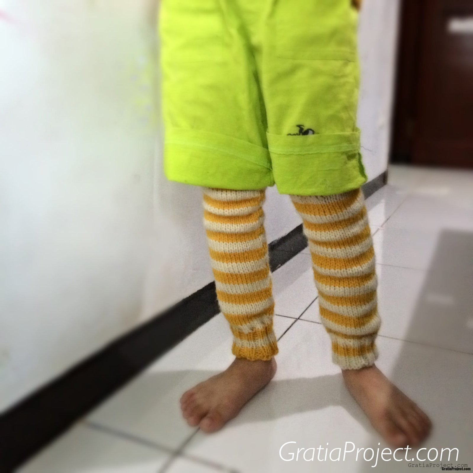 This is my newest project, super easy striped leg warmers for children. I made this for my 5 years old boy, Kenzo. These striped white and yellow loose leg warmers is fun to make, and also fast because I used worsted weight yarn. I used the leftover Cascade 220 yarn from my previous project, wool diaper soaker.